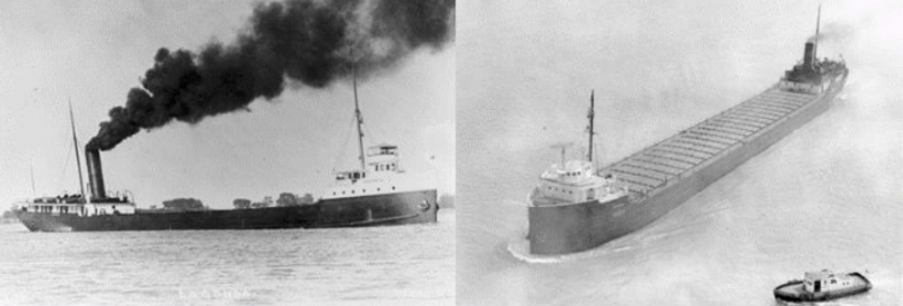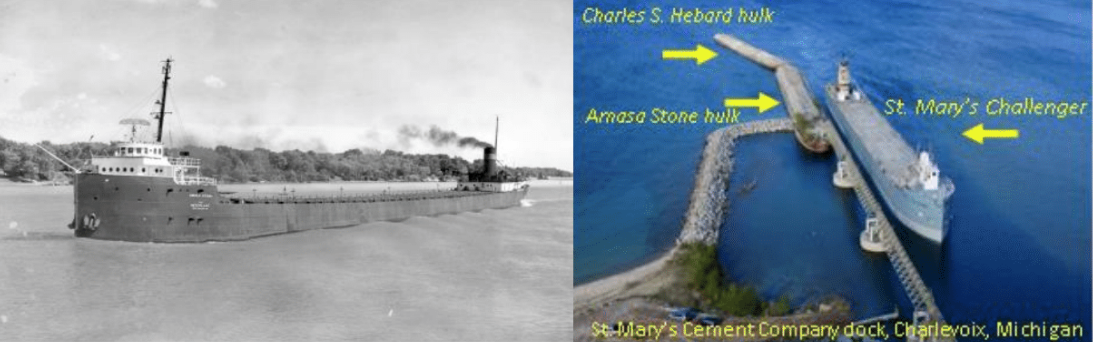 Above right: the hulk of the Amasa Stone today (after being converted to a breakwater in 1965 along with another ship, the Charles S. Hebard, in Charlevoix, Michigan 24) shown at left next to “Bay View’s ship” the St. Marys Challenger which today still calls in Bay View at the St. Marys Cement dock on the Kinnickinnic River dock just north of Becher Street (photo: St. Marys Cement Company). 25